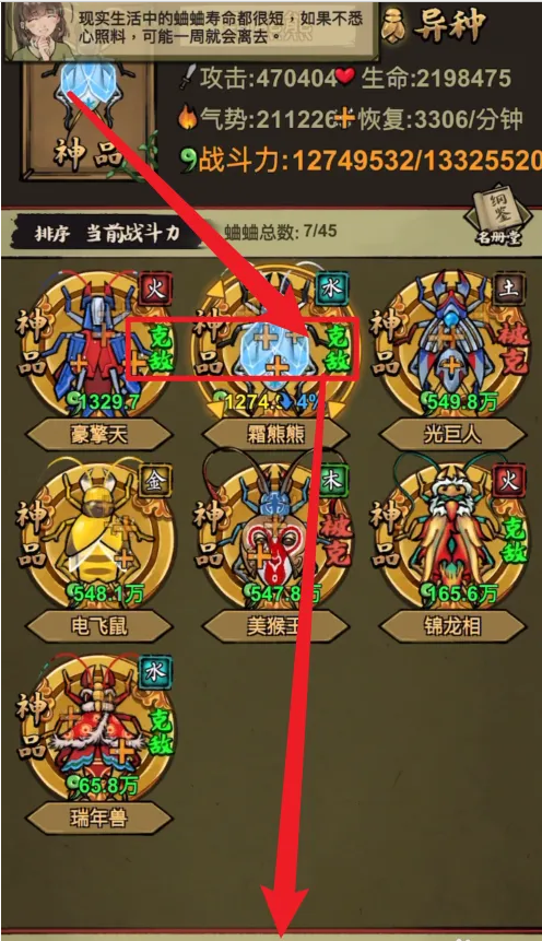 2、然后在压轴上阵蛐蛐列表中选择标记为克敌的蛐蛐并点击上阵