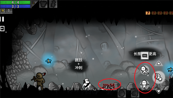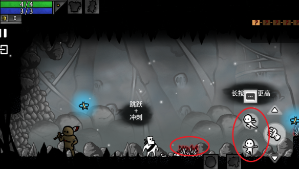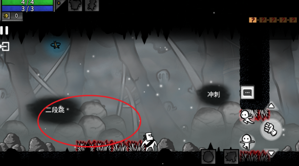 5、第三个钉刺需要完成二段跳,才能过关哦,还是跳跃加冲刺一起长按