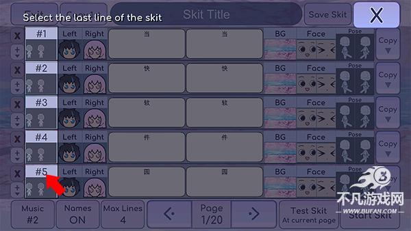 7、动画创建完成之后,点击下方的Max Lines选项,然后点击我们创建的动画最后一帧例如我们这里只创建了5帧那么点击#5即可,Music可用于切换动画背景音乐,如果想要显示/隐藏角色名称,那么点击Names进行切换即可。