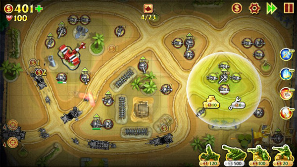 游戏中的防御塔一共有着四种类型,分别为步枪兵20$、火焰喷射兵100$、加农炮500$和防空炮120$