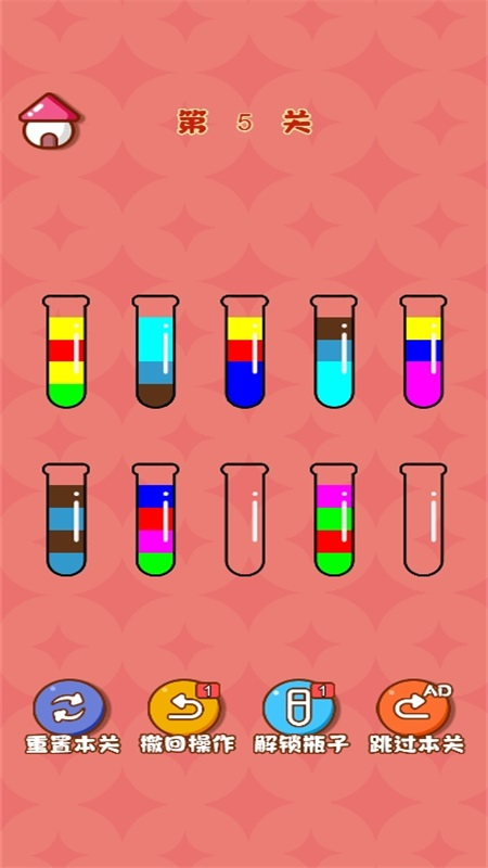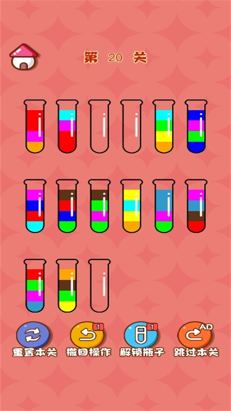 1、将试管中的不同颜色液体进行归类,富有创意的休闲小游戏。