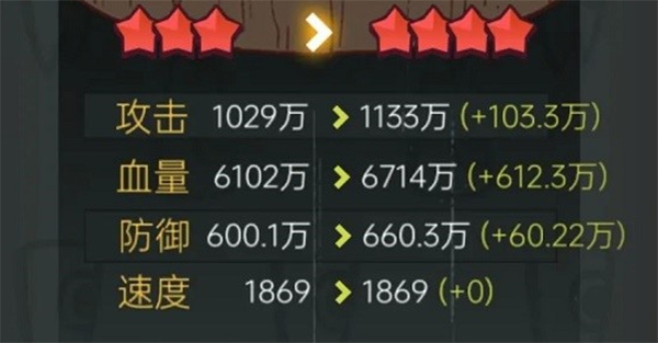 5、一颗皇冠之后,每提升一个星级,增加15%属性攻击、防御、血量。那么从一颗皇冠到四颗皇冠的属性提升为1*115%*115%*115%=1.52倍。并且四颗皇冠武将能觉醒前面两个技能主动技能+被动1。