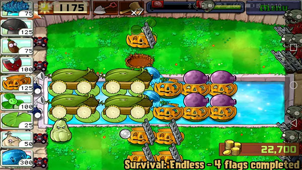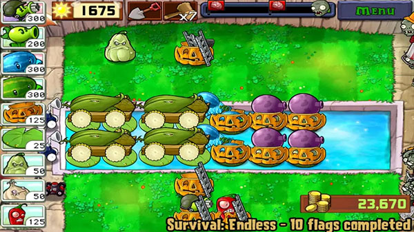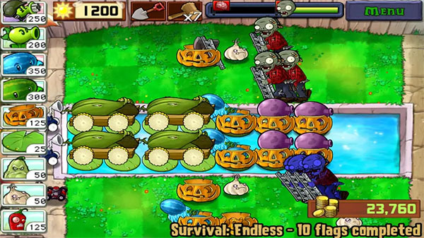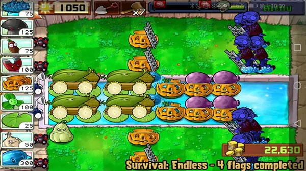 打到了5、6面旗帜时,就可以开始上“炮”了(这里注意一下,玉米加农炮不可以种南瓜头去保护,要种上玉米加农炮的玉米投手上也不能种南瓜头。):