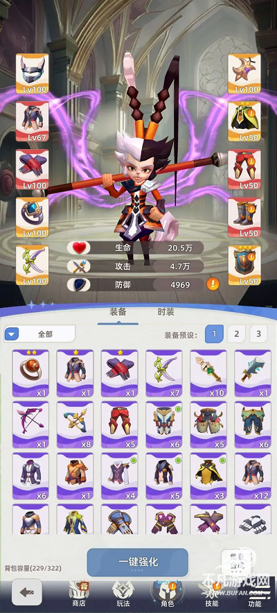 3.在角色页面,你可以进行装备强化和合成。强化很简单,优先提升攻击力点击已穿戴的装备就能看到强化后的属性加成。合成功能可以批量合成蓝色和紫色装备。提升星级需要同部位的装备,而提升品质则需要相同名字的装备。记得看清楚再合成,因为目前还没有拆解功能