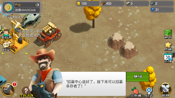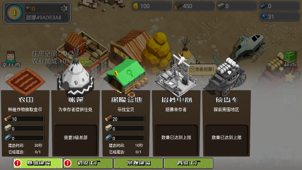 点开左下角的建造按钮就可以早各种建筑了,例如帐篷可以为幸存者提供住处并产出金币,农田可以种植作物,木材厂可以产出木材,招募中心可以招募幸存者等等。