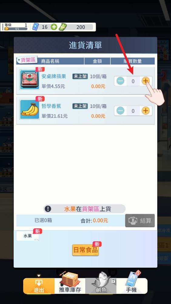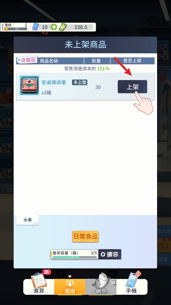 2、在这里挑选好需要进货的商品,付款后即可开始运送,可以消耗体力让其快速送达。