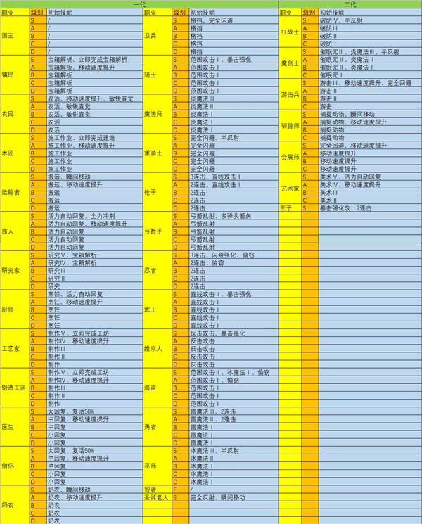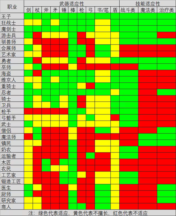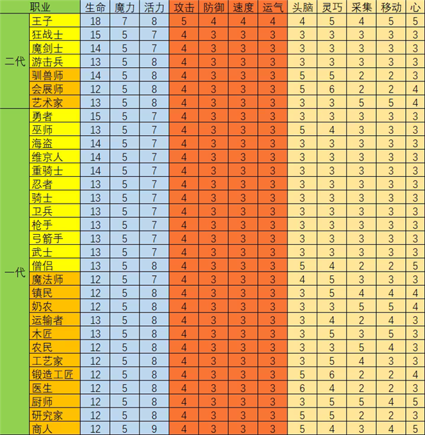 从此图可以看出,最适合战斗的首先是王子,然后是勇者、狂战士;最适合当法师的不是魔法师也不是巫师,而是驯兽师魔力、头脑值比较重要;最适合出去调查的是镇民或者奶农心影响调查的成功率。