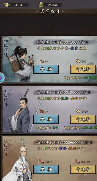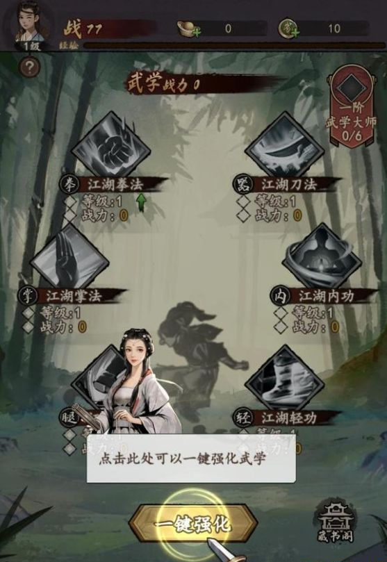 2.在游戏中有这一个武学系统,这个系统是玩家提升自己实力的最主要来源,前期玩家需要尽可能的提高自己的武学等级,这样就可以提升不少的战斗力,升级武学需要消耗武学币,而武学币可以通过闯荡江湖获得。