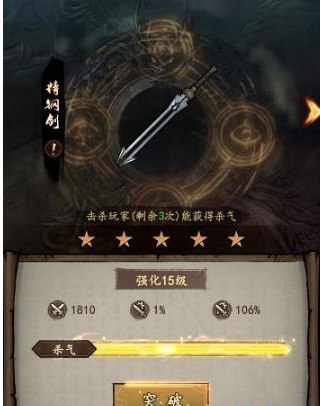3.兵器系统是提高玩家基础面板的最重要途径,兵器能够极大的提高玩家自身的攻击力、暴击率以及暴击伤害这三个属性,兵器能够进行升级以及突破,不管是升级还是突破都是需要消耗杀气这个材料的,所以杀气一定要尽可能多的获取哦。