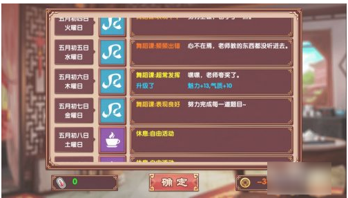 第二就是在学习时一定要注意检查自己的资金够不够用,如果不够用的话后面的日程就会全部变成休息,而休息一个月的话则会增加大概20左右的叛逆值。