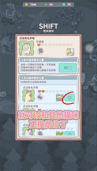 3、点击下图红框图标,就可以和其他猫咪更换岗位了