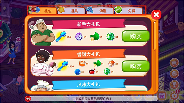 8、返回疯狂大厨游戏主界面,选择【购物车】图标,包括礼包、道具、汤匙和免费等栏目,玩家可根据需求进行选购,