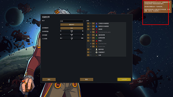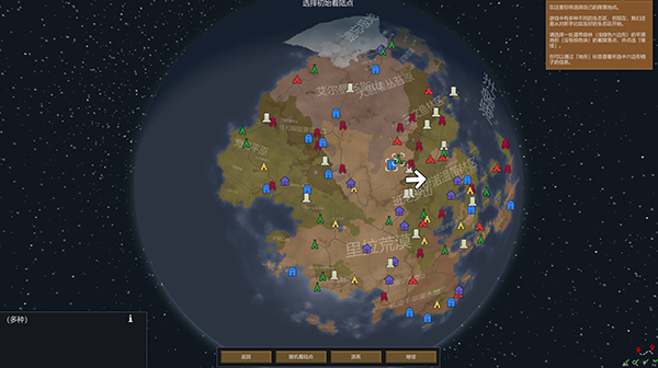 游戏允许你自定义世界的大小,并且可以选择出生地的位置。不同区域的开局难度会有所不同,例如在气温较低的地方生存将更加困难,靠近其他派系会增加被攻击的风险。