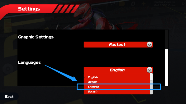2、在语言设置选项下,我们将其切换为中文显示,具体操作如下图所示,除了语言以外,游戏内的显示画质也可在此设置。