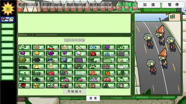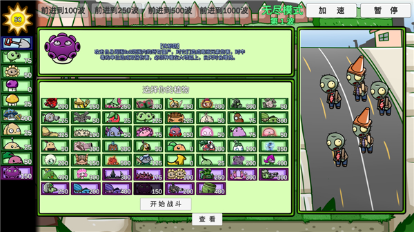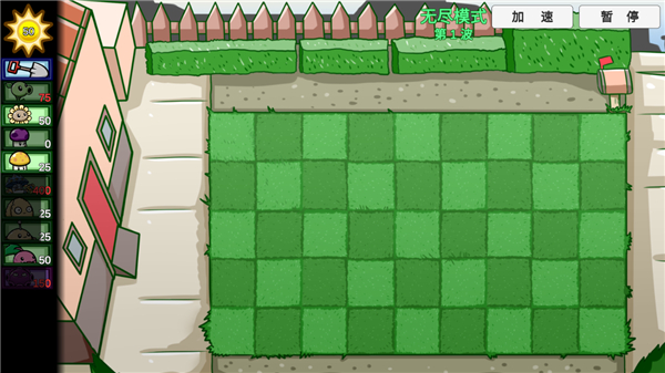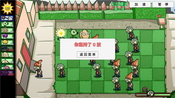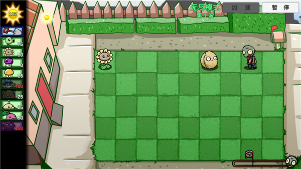 6、僵尸开启第一波入侵,如果你觉得速度慢的话,可以点击右上角的加速按钮;