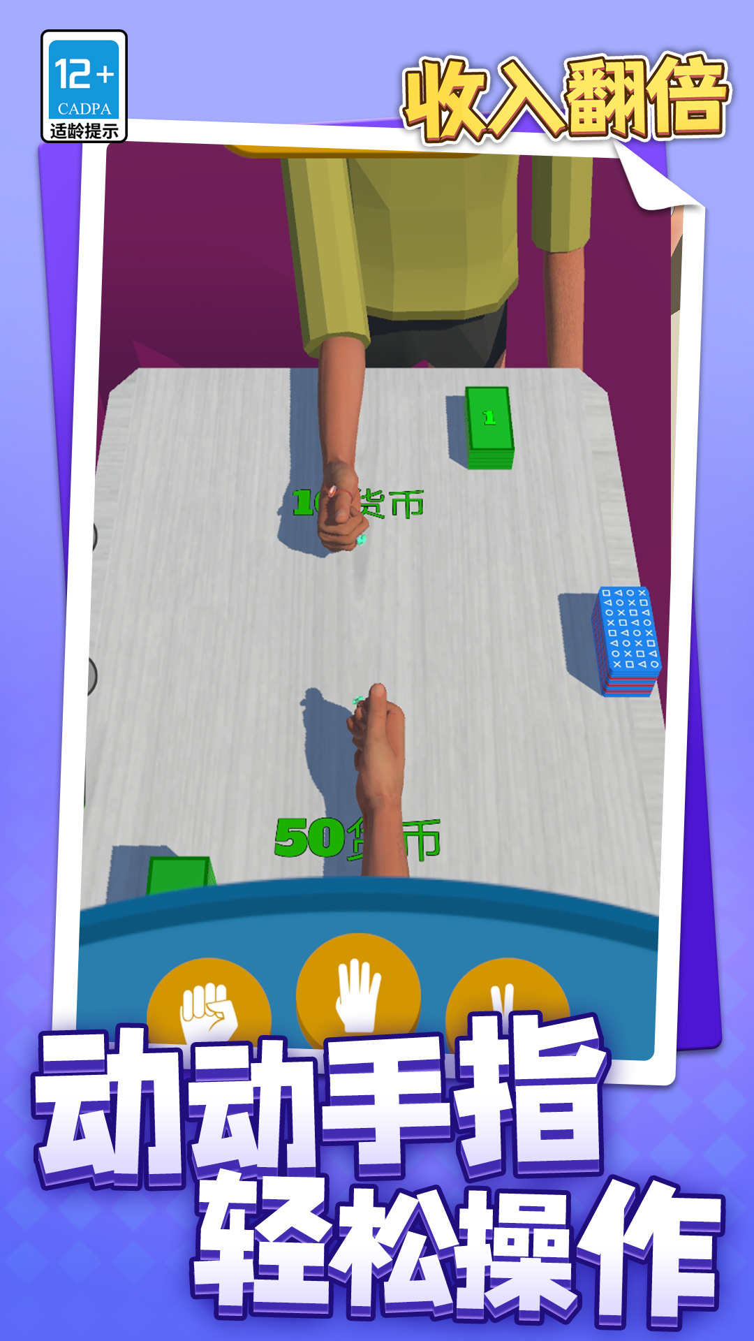 出售自己名下的房产获得初始资金,不同颜色的卡片代表不同大小的货币,玩家要先从卡组里面抽取一个卡片,然后放在桌子上面,跟对方进行石头剪刀布,赢的一方可以获得同等价值的货币,就看大家敢不敢每一把都放高价值的卡片了!收入翻倍游戏可以让玩家一把暴富,也能一次输干净!