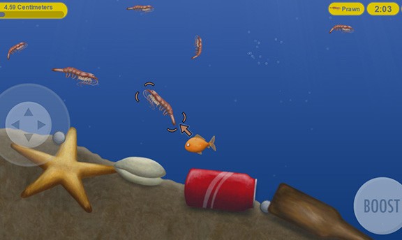 2、游戏中的控制采用虚拟摇杆操作方式,左边为控制小鱼的移动,游遍为耐力加速,点击即可获得加速效果。