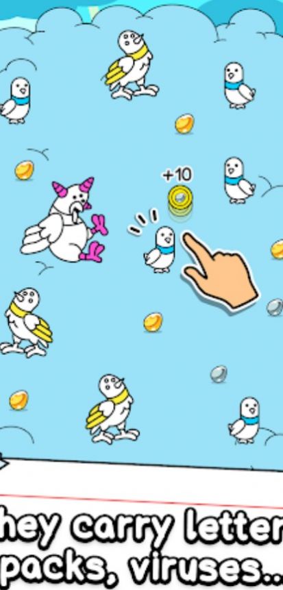 1、玩家需要在游戏中不断点击屏幕,使鸽子产蛋,产下更多的新鸽子,合成鸽子,变异鸽子,取得进展。