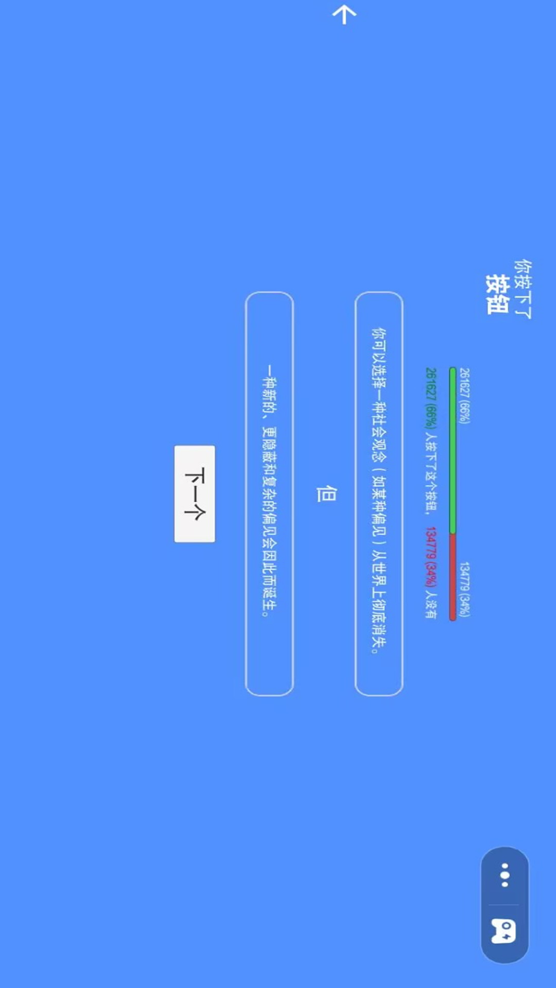 2、能看到其他玩家的选择比例,比如某个问题有70%的人按了按钮,你可以偷偷参考但最后还得听自己的。