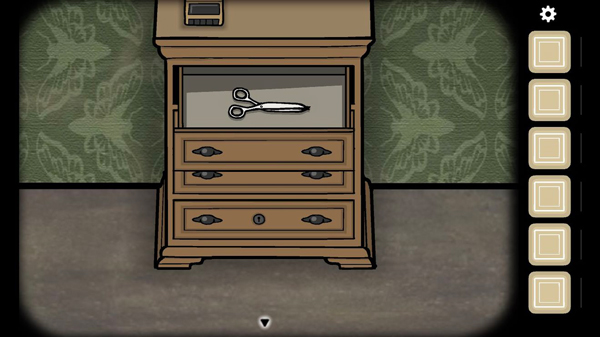 柜子上有个复读机,看来是放磁带的。旁边有打字机。还有一株植物。用剪子可以剪下来树叶。还有门旁边的开关开灯。灯里面有照片碎片。