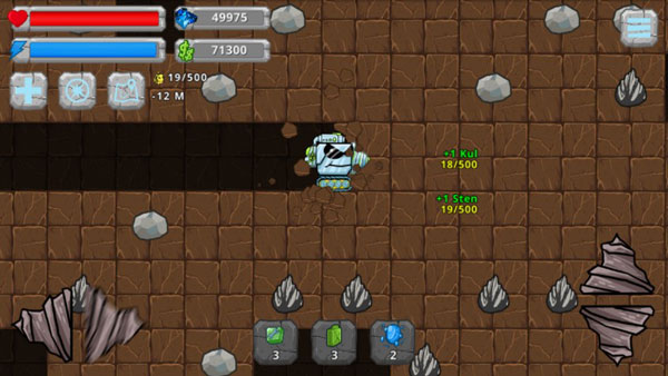1、总体来说,游戏的玩法还是比较实在的,通过向左、向右和向下挖掘,向上可进行火箭上升,期间这些操作都需要挖掘机耗能。游戏以探索地底世界,获取贩卖地底的稀有资源为目标,由此往复来改装升级你的挖掘机。