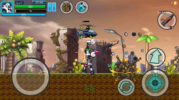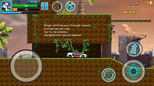 1、进入游戏,左侧硕大的圆圈为虚拟摇杆,右侧有跳跃、射击、变身以及弹夹容量。