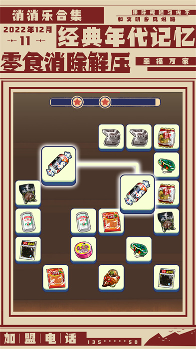 1、我们需要将相同的物品进行连线匹配,但是要注意连接配对消除是有条件的;