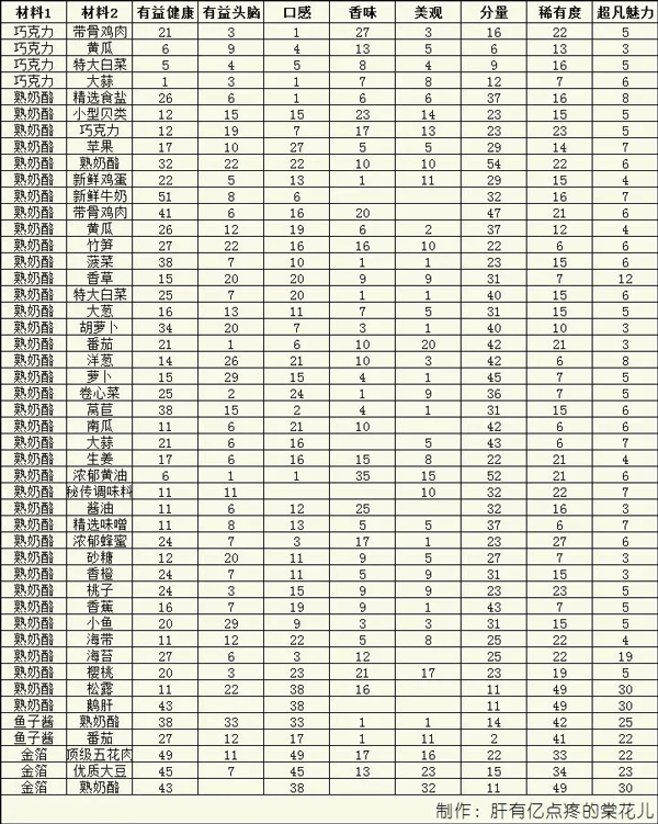 这个表也有它一定的适用范围,它在料理本身八维数值都极其临近100的时候可能会出现降低某种数值的情况。