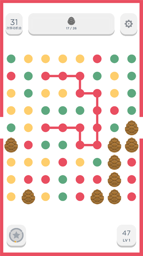 可以说是脱离了三消类游戏的概念,它的主要玩法是通过连线的方式,将相同颜色的圆点连起来消除。可以连接的圆点数量并没有限制,不过需要注意只可横竖相连,不可斜连;也就是说我们可以一次进行2消、3消、4消甚至是全消。全消就像是炸弹:只要连接时形成一个正方形,即从起点出发能在回到终点,那么当前所有该颜色的圆点都会消除,全消是这款游戏中达到目标最便捷的方法,我们通过2消、3消更多的目的就是使相同颜色的圆点排正方形,成为一个全屏同色炸弹!