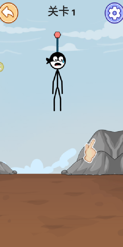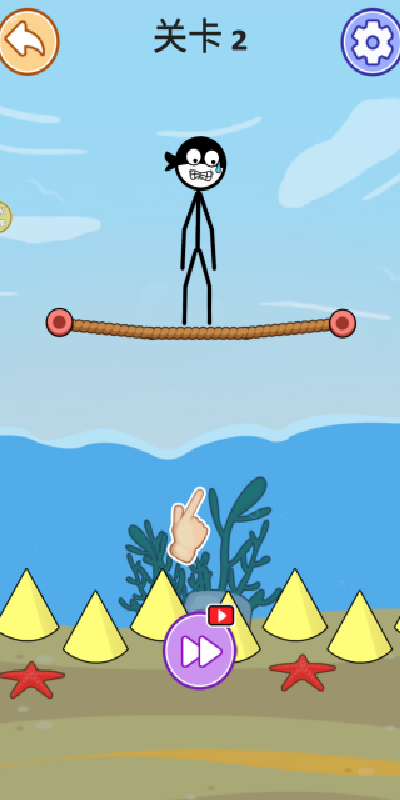 3、第二关是火柴人站在绳子上,你要去把绳子拉扯断,就可以看到火柴人掉了下来。