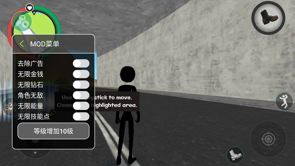 左侧移动、加速,右侧绳索,攻击(跳跃),跳跃,右上侧的武器更换以及血量、经验的显示都实时更新,一览无遗,凭借着大家自由的玩法,与其他帮派的人物进行交火,期间杀人能够获得经验,杀多了会产生星级,警察和其他附近角色会特殊照顾你对你展开火热的进攻,而如何存活,如何将其他人物击杀则是你所需要完成的任务。
