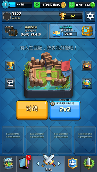 2、在对战界面点击“对战”搜索对手,匹配系统会为玩家搜寻与玩家奖杯数相近的其他玩家,玩家拥有的卡牌数等级并不会影响对战匹配。