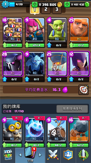 卡组的搭配一定要考虑均费,除了采集器卡组,一般情况均费不要超过4费。均费过高,证明大费卡过多,就会导致下卡时出现差一费的情况,有的时候就是因为这一费,导致防守不及时而时防御塔损失大量血。