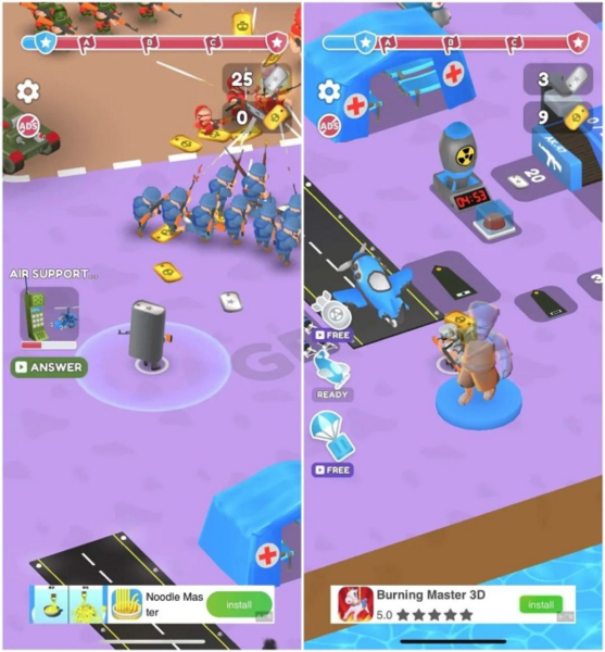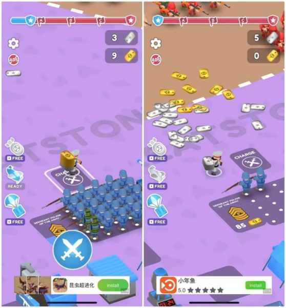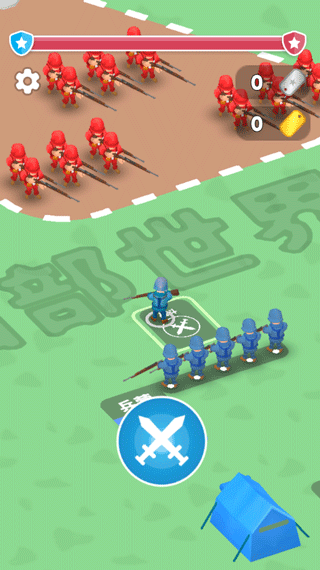 战斗开始后,士兵会自动前进,双方接触后开始交战。战斗会掉落资源,是主要的资源获取途径。此外还有空投可获得资源,但数量和效率都低于战斗。可见,游戏也鼓励玩家多多战斗,而不是“苟着”。