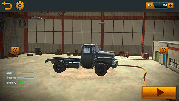 1、点击开始游戏后,玩家可以在车库选择你要驾驶的卡车,不同的车型,动力、时速、以及金币收入也都不一样,你可以使用金币购买解锁更加炫酷的卡车。