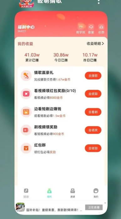 1、通过听取15秒的音乐片段,在限定时间内从选项中选出正确歌名,即可获得丰厚金币奖励。而观看平台内的激励视频广告,更是能让你的收益倍增,每条广告都能带来实实在在的金币入账。