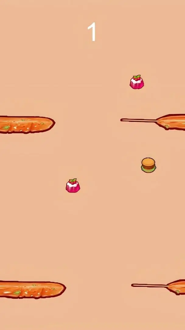 1、玩家需要控制角色在汉堡店内不断向上,避开障碍物,收集汉堡材料。