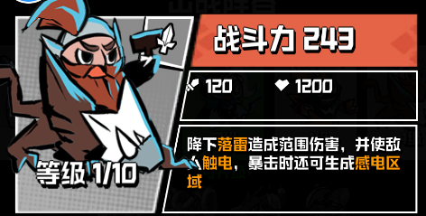 降下落雷造成范围伤害,并使敌人触电,暴击时还可生成感电区域。