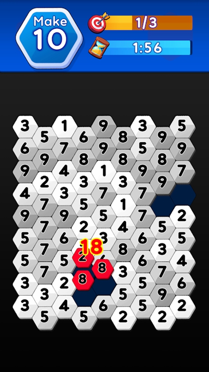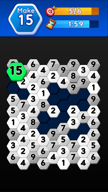 每个六边形里面都有一个数字,相邻的两个数字如果一样,就可以将它们合并,形成新的六边形,里面的数字会变成这两个数字的和!六角合并(hexamerge)游戏的要求是玩家需要合并得到一个最大的数字,这个数字比关卡设定的数字大,就可以过关啦!