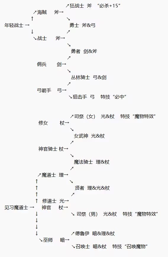 本作作为系列首次引入转职分支的作品,角色虽拥有初始下级职业,但可通过玩家操作自主转职为上级职业。转职需达到特定等级并使用特定道具,道具类型因下级职业而异