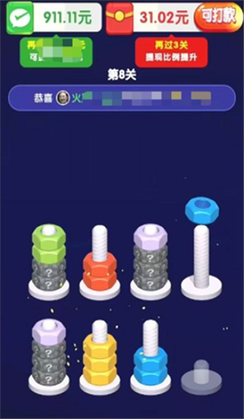 4、遵循此法,逐一清除所有螺丝,直至挑战圆满达成,红包奖励即刻到手。