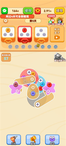 2. 关卡设计:游戏设有多个关卡,随着关卡的解锁,难度逐渐增加,螺丝的数量和分布也会更加复杂,挑战玩家的逻辑思维和反应速度。