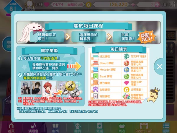 【6】每日课程。在【每日课程】中打歌可以获得各种各样的丰厚奖励,奖励可用于【练习】【觉醒】【特训】等。