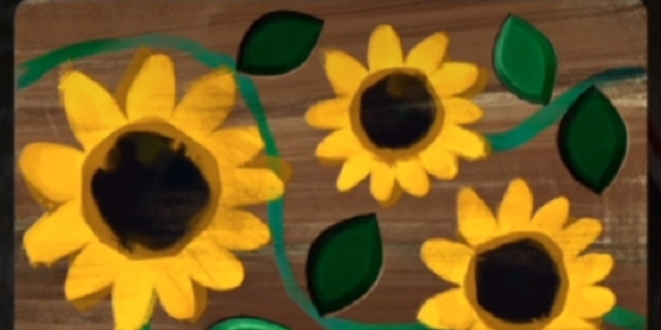 9.记住向日葵手稿中的深色位置,来到货架旁,找到向日葵图案的木盒,对照画册,点击叶子部分,取得绿色颜料
