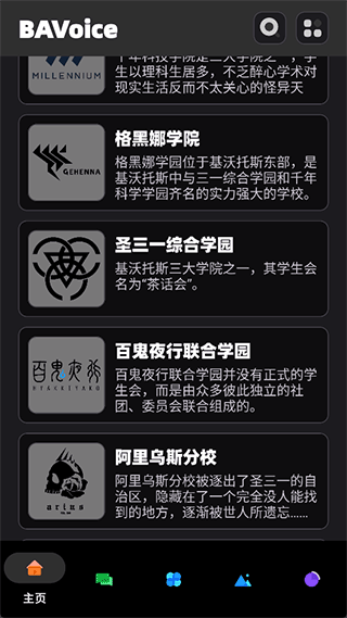 1、多角色语音分类:对游戏内各角色语音进行系统分类,涵盖基沃托斯地区各学院角色,如阿拜多斯高等学院、千年科技学院等,方便用户按学院、角色查找语音。