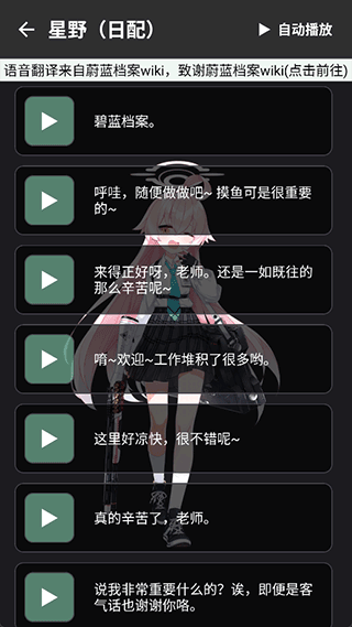 1、收集了《蔚蓝档案》中大部分角色的语音包,用户可以在这里听他们的语音素材。