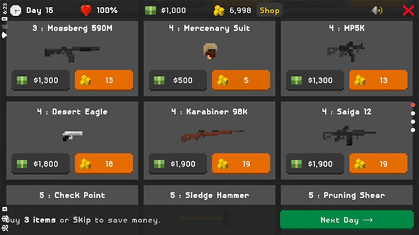 2、购买到更加强大的武器去进行战斗,操控自己的角色来抵御各种僵尸的袭击,让自己能够顺利的生存到更多的天数;