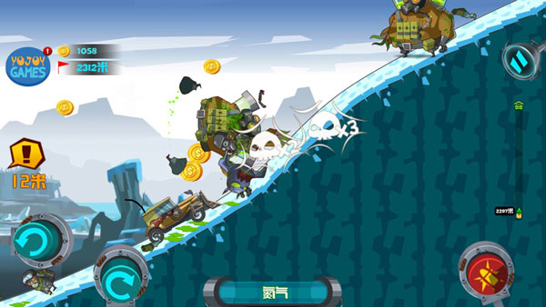 然而前方的生化怪物的数量越来越多,常言道:双拳难敌四手,再厉害的武器也无法抵御密集阵般的生化僵尸群。兵法有云:三十六计走为上计。是时候展示你的绝技了!当载具行驶到每个坡道并向上飞起的时候,对,就在这个时候,你可以通过长按左或右操控键,让载具做后空翻或前空翻特技(在空中连续做特技将会有惊喜哦,但是要记住正确着地的姿势,否则载具会爆炸的哦)。
