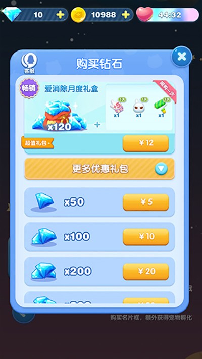 百变造型,总有一只宠物萌化你!更有自带超强技能的月亮宠物,助力你的爱消除之旅!