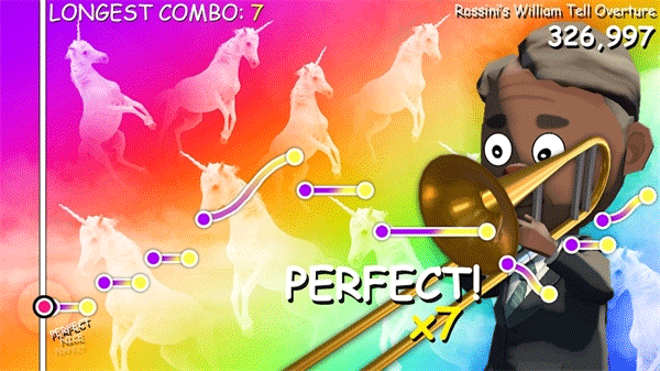 Trombone Champ 拥有超过 20 首曲目,其中包括国歌、进行曲、古典乐曲、电子乐、民间经典等等。该游戏还包括令人兴奋的客座艺术家的曲目。每首曲目都有一个独特的动画背景,随着音乐移动!